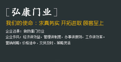 河北弘康門(mén)業(yè)有限公司     河北弘康門(mén)業(yè)有限公司是一家生產(chǎn)防爆門(mén)窗、泄爆門(mén)窗、密閉門(mén)窗、防火門(mén)窗、監(jiān)獄門(mén)、隔音門(mén)、變壓器門(mén),隧道抗風(fēng)壓防火門(mén),隧道防護(hù)門(mén),3小時(shí)防火門(mén)窗,防火玻璃門(mén),雙向開(kāi)啟防火門(mén)等特種門(mén)窗的生產(chǎn)廠(chǎng)家。河北弘康門(mén)業(yè)有限公司一直致力于防爆技術(shù)、新產(chǎn)品的研究開(kāi)發(fā)工作。